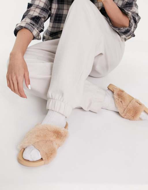 ASOS DESIGN - Pelsede sliders med krydsrem i kamelbrun