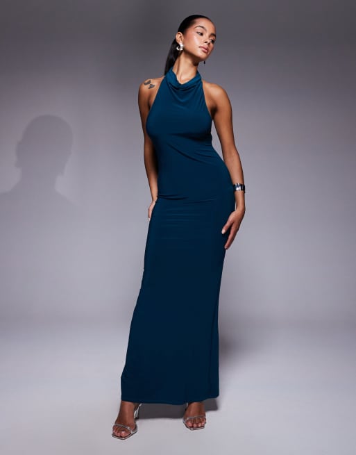 ASOS DESIGN - Petroleumsblå og draperet halterneck-maxikjole med åben ryg