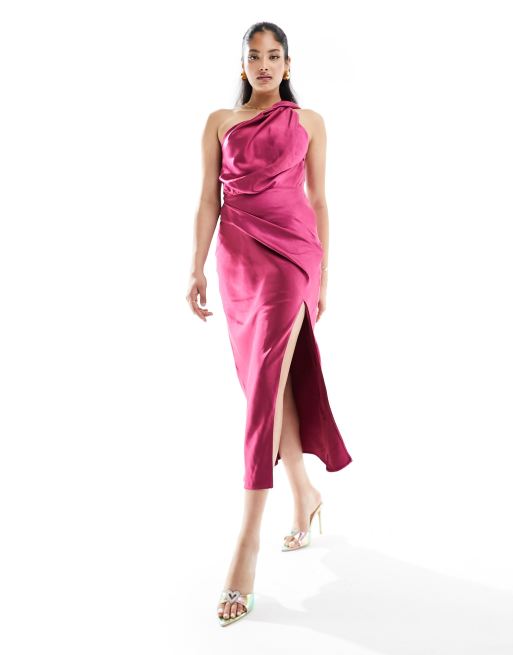 ASOS DESIGN - Pink midikjole med snoet skulder og slids i satin