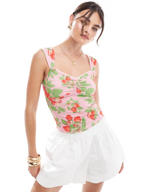 ASOS DESIGN - Pink top med jordbærprint og rynket front med indsyede detaljer