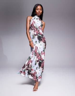 ASOS DESIGN - Plisseret halterneck-maxikjole med bindebånd og mørkt blomstermønster
