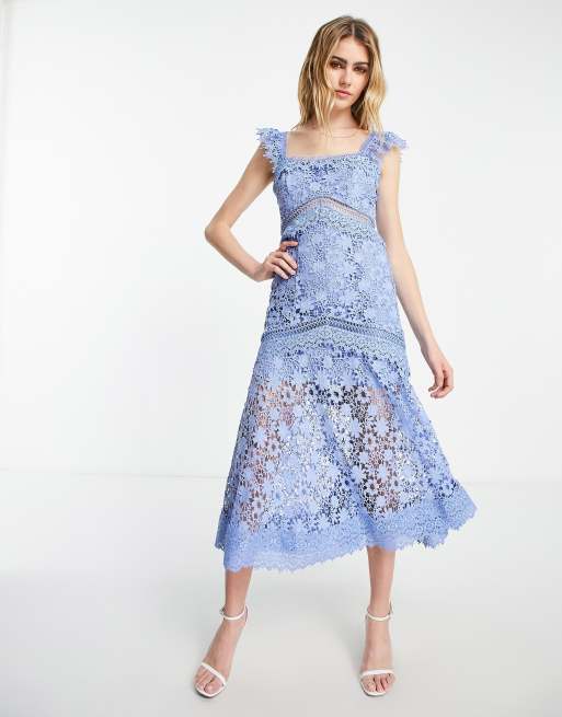 ASOS DESIGN - Premium - Blå midikjole med flæsedetaljer og blonder