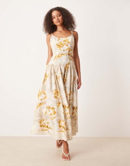 ASOS DESIGN - Premium - Midikjole med stropper og sømdetaljer samt sænket talje og gult blomsterprint
