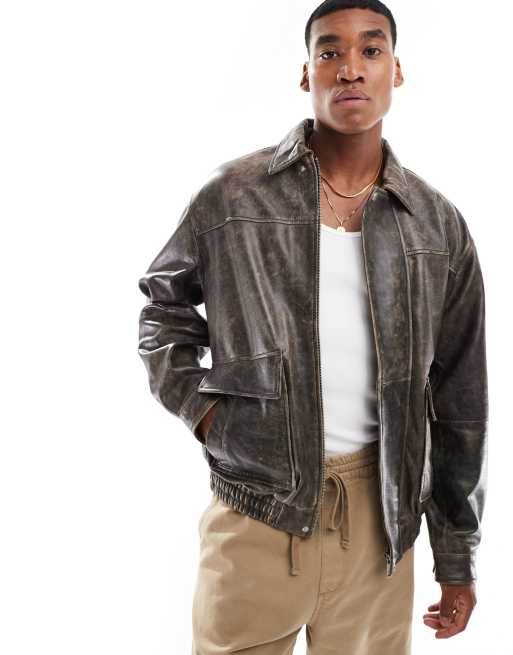 ASOS DESIGN - Premium - Oversized bomber-jakke i ægte læder i vasket brun