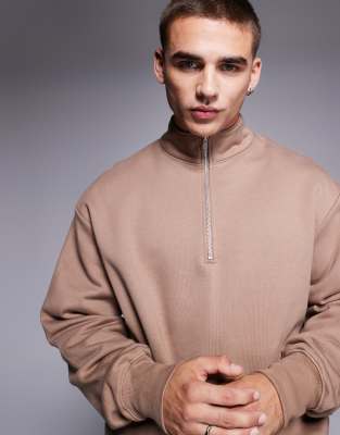 ASOS DESIGN - Premium - Oversized og beige sweatshirt med kvart lynlås i kraftigt 400 gsm-stof