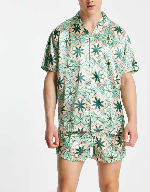 ASOS DESIGN - Pyjamassæt med skjorte og shorts med blomsterprint i satin