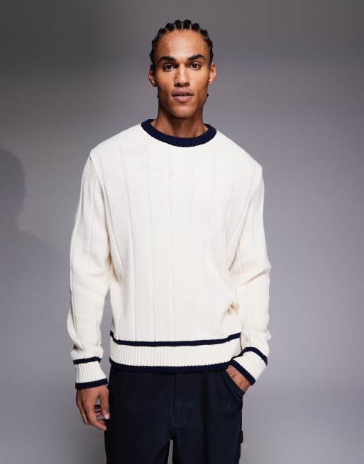 ASOS DESIGN - Råhvid oversized trøje i bred ribstrik med marineblå kantstriber