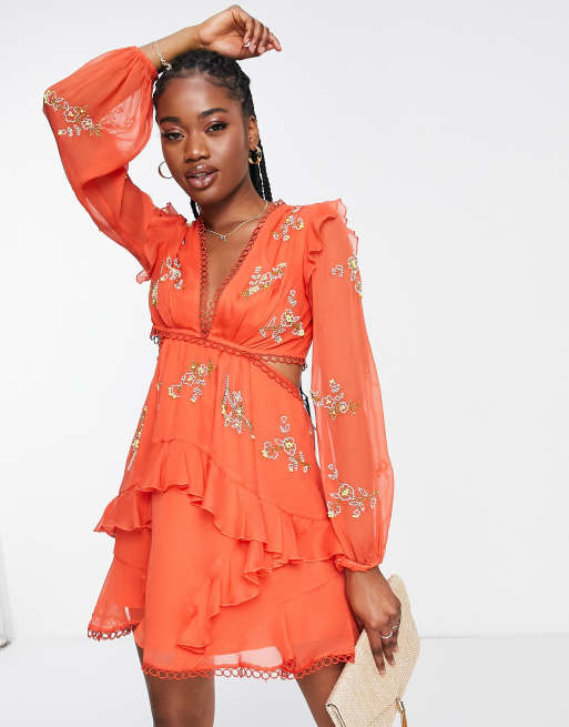 ASOS DESIGN - Rød blomstret minikjole med cirkeldetaljer og blomsterudsmykning