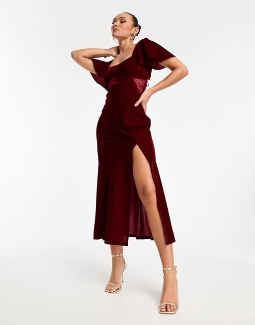 ASOS DESIGN - Rød midikjole med flagrende ærmer og blondeindsats i velour