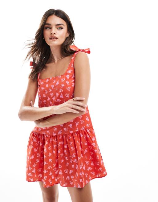 ASOS DESIGN - Rød poplin-minikjole med bindebånd sænket talje og småprint