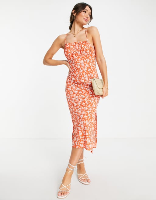 ASOS DESIGN - Rød slip-maxikjole med rynket buste og åben ryg i blomstermønster