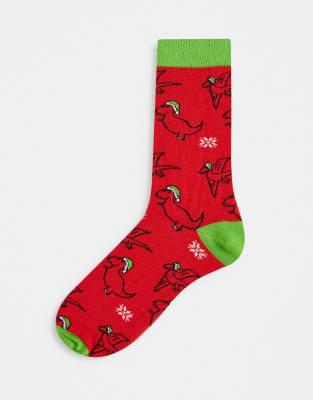 ASOS DESIGN - Røde ankelsokker med juledinosaur-print