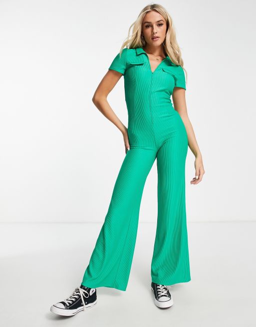 ASOS DESIGN - Ribstrikket 70'er-jumpsuit i lysegrøn med krave og lynlås