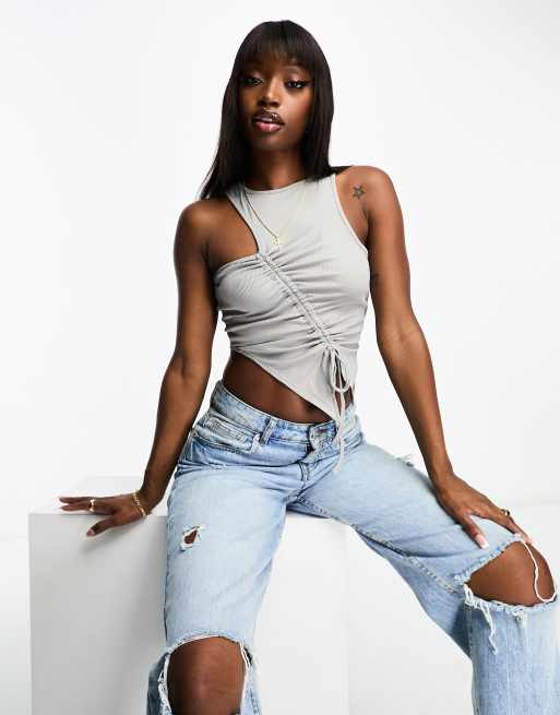 ASOS DESIGN - Ribstrikket tanktop med rynket løbegang foran i grå