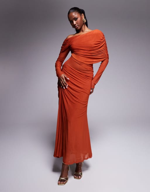 ASOS DESIGN - Rustrød og langærmet maxikjole i løstsiddende pasform i mesh med bardotsnit