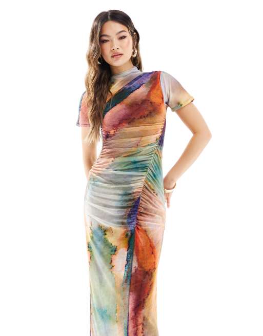 ASOS DESIGN - Rynket maxikjole med akvarelprint i mesh