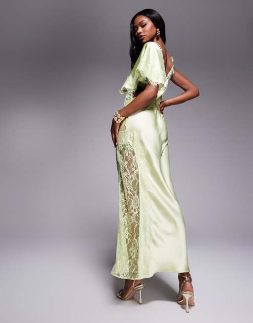 ASOS DESIGN - Salviegrøn oneshoulder-maxikjole i satin med blondedetalje