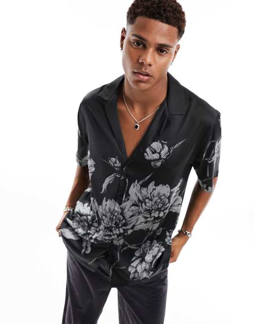 ASOS DESIGN - Skjorte med afslappet pasform og reverskrave i sort satin med blomsterprint