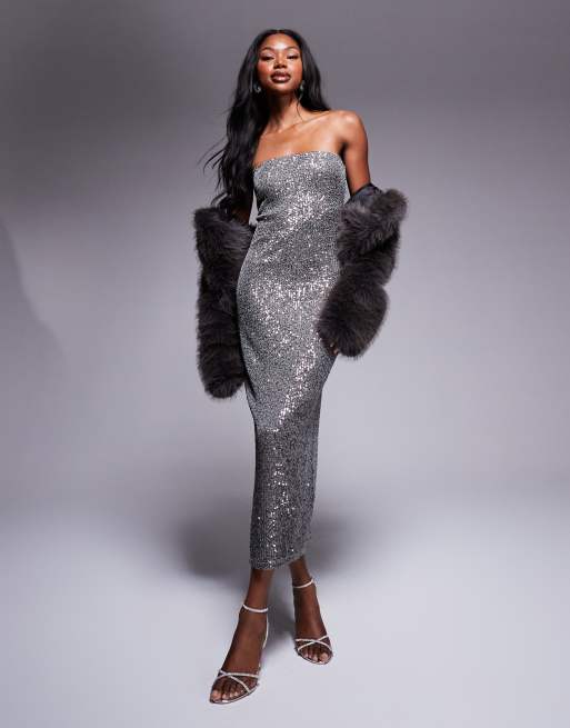 ASOS DESIGN - Sølvfarvet bandeau-midikjole i pailletstof