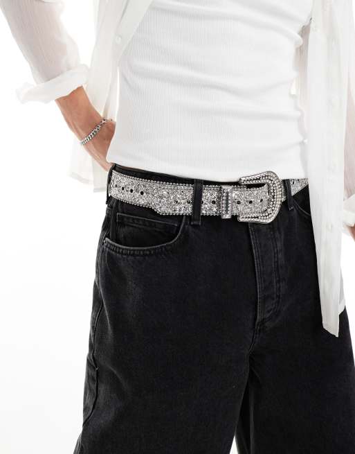 ASOS DESIGN - Sølvfarvet westernbælte i imiteret læder med imiterede krystaller og glimmer