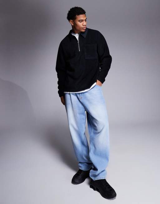 ASOS DESIGN - Sort afslappet rugby-sweatshirt i fleece med polokrave og kvart lynlås