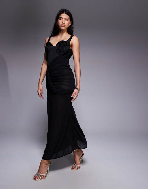 ASOS DESIGN - Sort bardot-maxikjole med blomsterdetaljer over brystet og draperet skørt