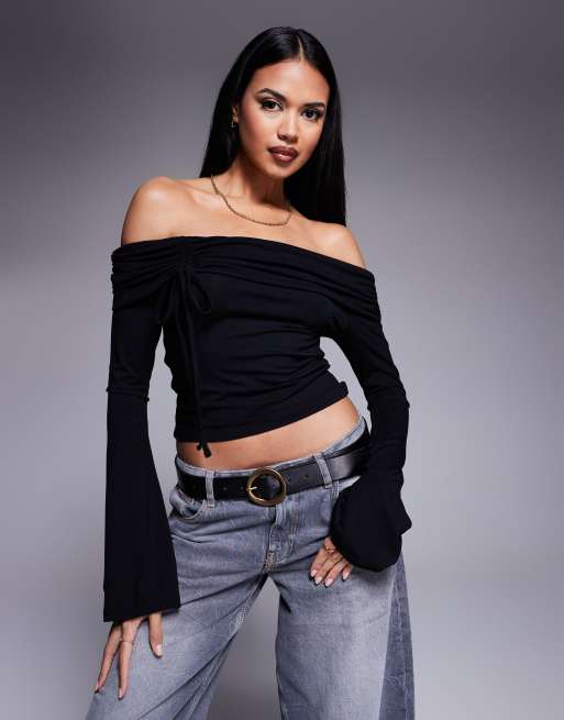 ASOS DESIGN - Sort bardot-top med offshoulder-snit og trompetærmer