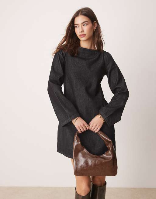 ASOS DESIGN - Sort/ecrufarvet og langærmet shift-kjole i denim med kontrastfarvede stikninger