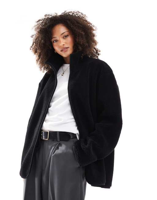ASOS DESIGN - Sort fleece med gennemgående lynlås i imiteret lammeskind