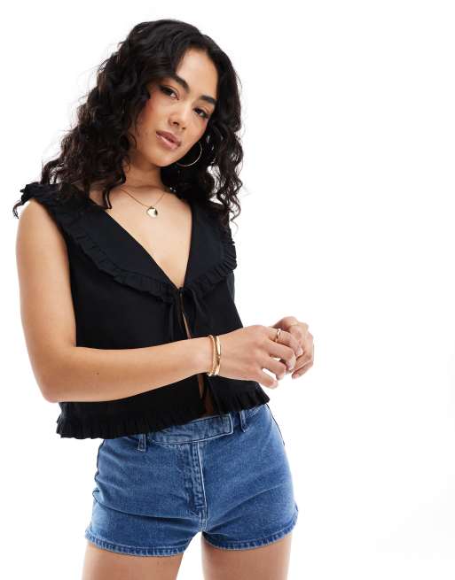 ASOS DESIGN - Sort habitvest med flæsekrave i hørlook