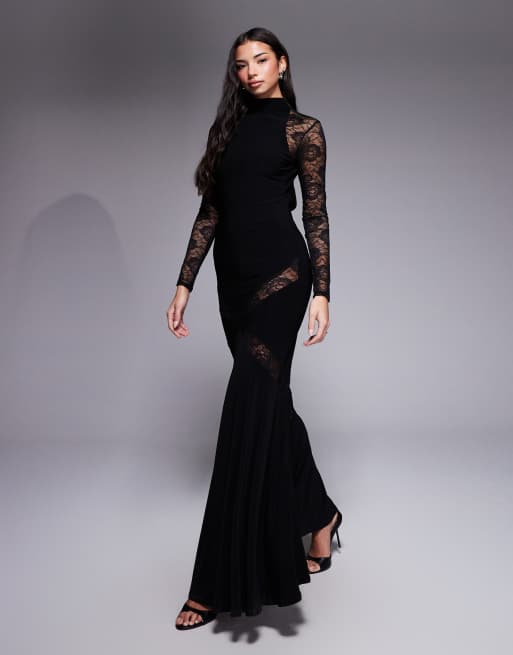 ASOS DESIGN - Sort højhalset maxikjole med blondepaneler