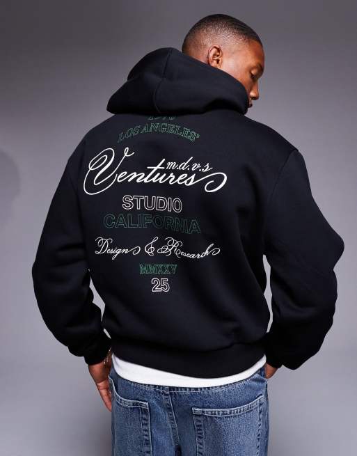 ASOS DESIGN - Sort hættetrøje med firkantet pasform og print på ryggen