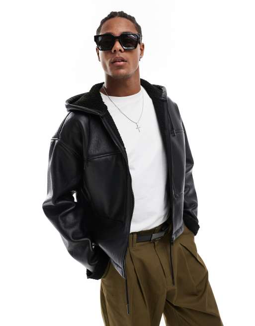 ASOS DESIGN - Sort jakke i imiteret læder med hætte og plysfor