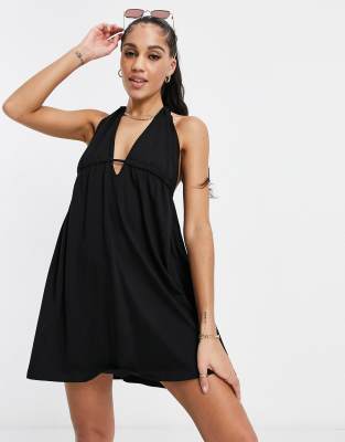 ASOS DESIGN - Sort jersey-strandkjole med halterneck, dyb udskæring og bindebånd på ryggen