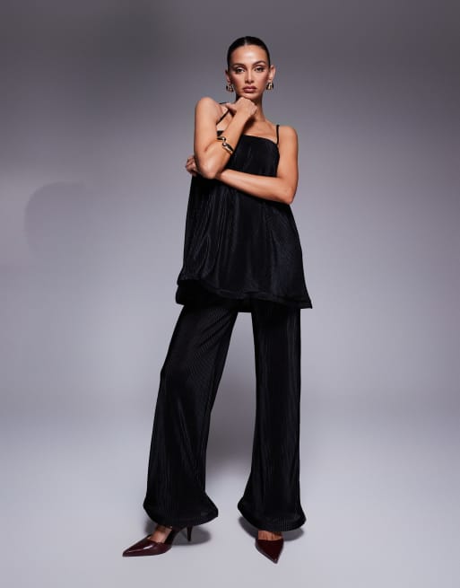 ASOS DESIGN - Sort jumpsuit med vide ben og plisseringer samt flæsekantsdetalje