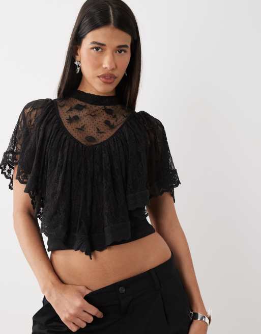 ASOS DESIGN - Sort kappetop med flagrende blonder og bindebånd bagpå