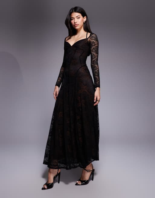 ASOS DESIGN - Sort langærmet maxikjole i blondemateriale med syningsdetalje