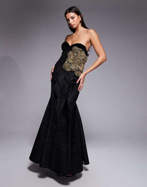 ASOS DESIGN - Sort maxikjole i velour med struktur og kiler samt guldfarvet blomsterudsmykning