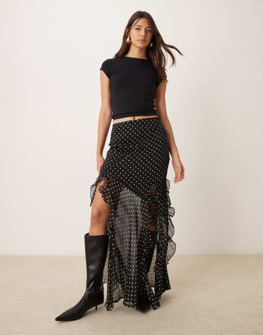 ASOS DESIGN - Sort maxinederdel med flæser og hvide prikker i chiffon
