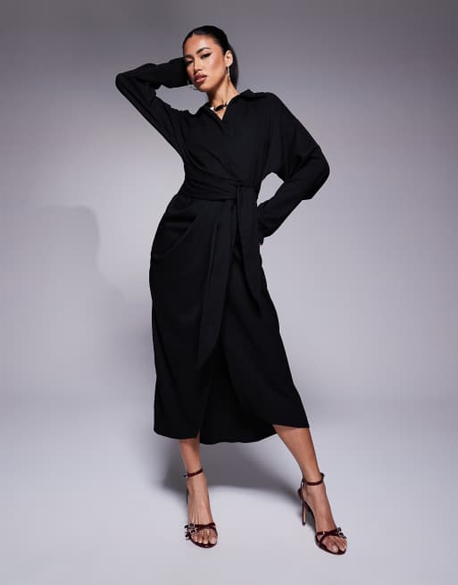 ASOS DESIGN - Sort midi-skjortekjole med slå-om-talje med bindebånd og tekstur