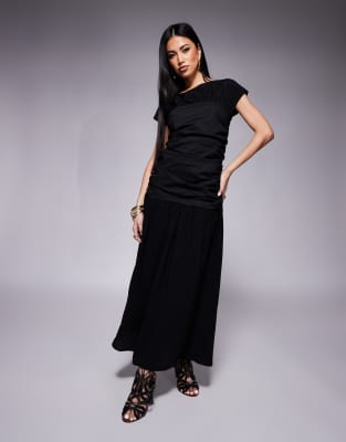 ASOS DESIGN - Sort midikjole med rund hals og rynket overdel