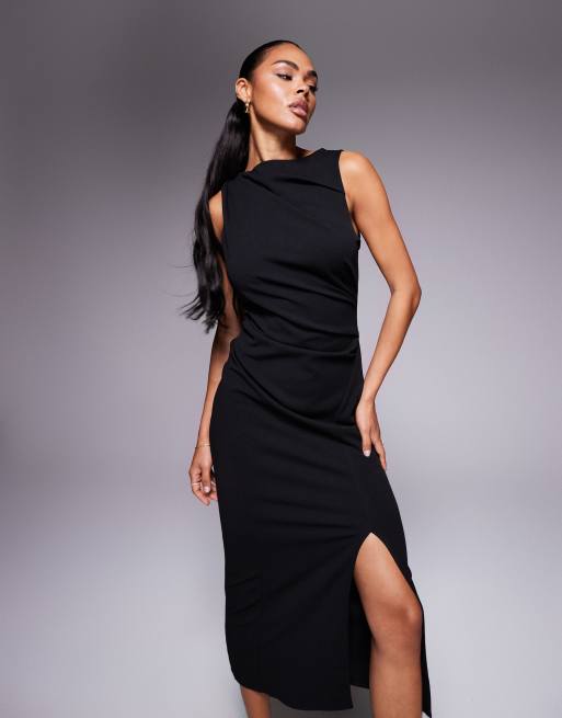 ASOS DESIGN - Sort midikjole med rynker og smal halsudskæring