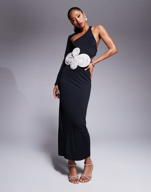 ASOS DESIGN - Sort midikjole med slå-om- og oneshoulder-snit og oversized, kontrasterende blomsterudsmykning