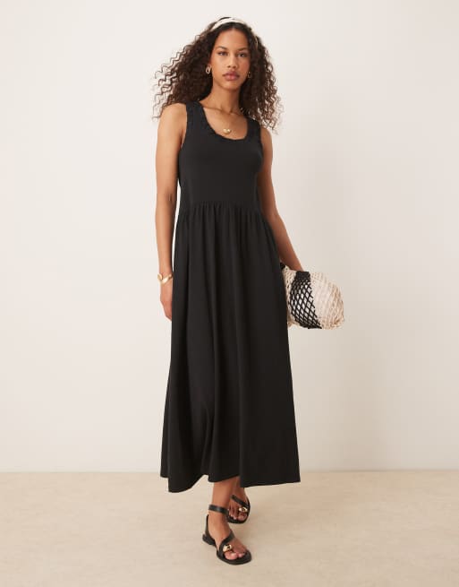 ASOS DESIGN - Sort midikjole med smock og dyb rund hals med rynker