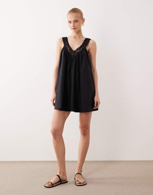 ASOS DESIGN - Sort mini-sundress med V-hals, smock-snit og blondeoverlag i poplin