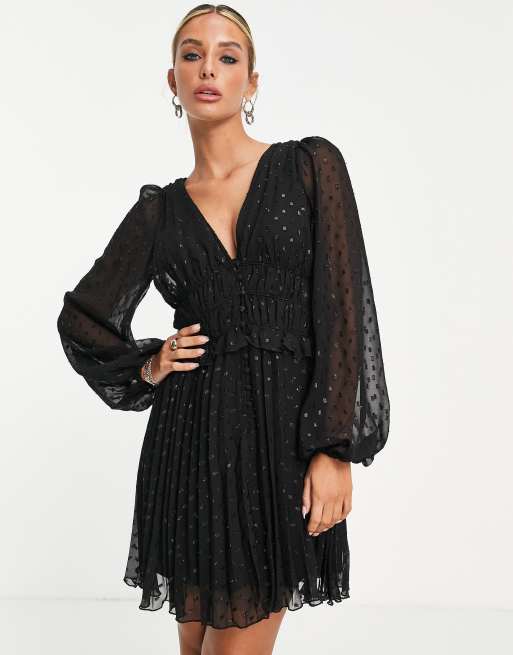 ASOS DESIGN - Sort minikjole med gennemgående knapper, plisseringer og rynket talje i metalfarvet dobby-stof