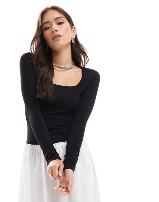 ASOS DESIGN - Sort og cremefarvet maxikjole med lange ærmer i poplinblanding
