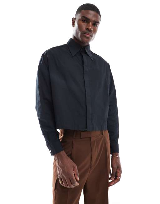 ASOS DESIGN - Sort og cropped poplinskjorte med 70'er-krave