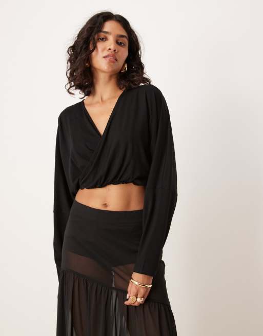 ASOS DESIGN - Sort og langærmet top med flagermusærmer og slå om-design foran
