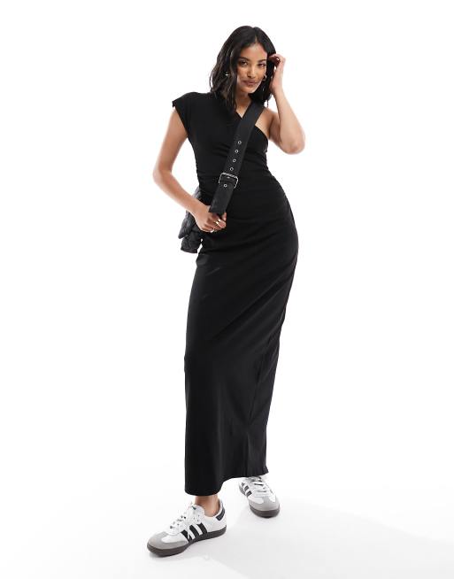 ASOS DESIGN - Sort oneshoulder-kjole med rynker i siden i midaxilængde